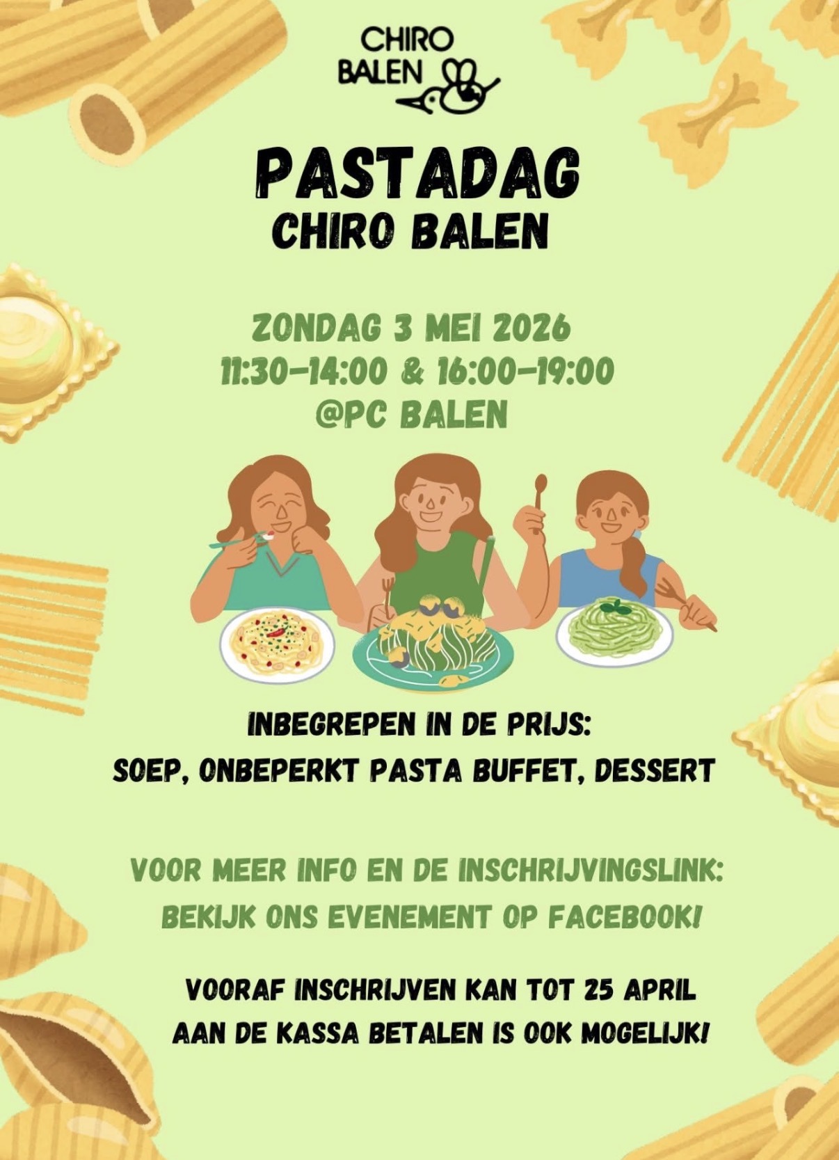 Wees welkom op de 2de editie van onze Pastadag op zondag 3 mei in de PC van Balen! π Geniet van een heerlijk (onbeperkt) pasta buffet, inclusief een kommetje soep & een dessertje! Er is voor ieder wat wils! π